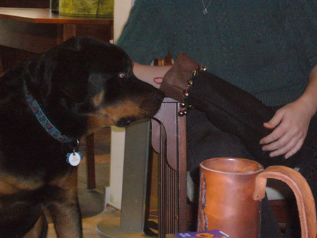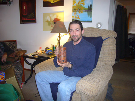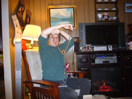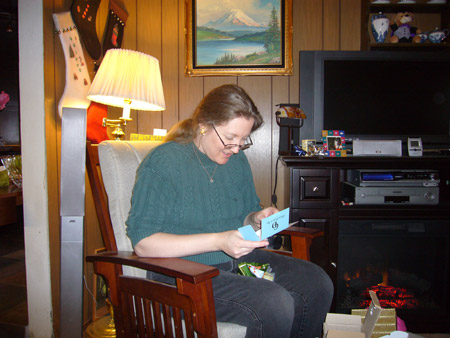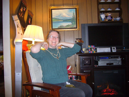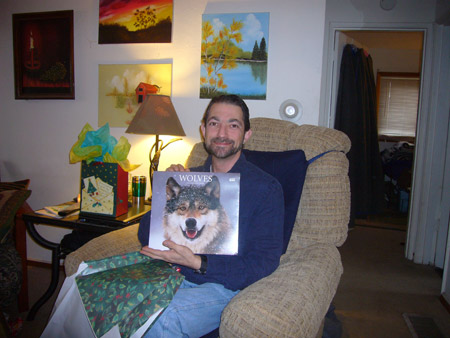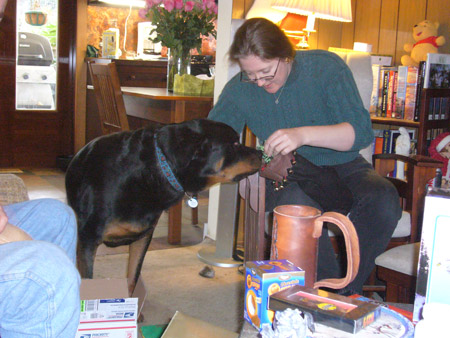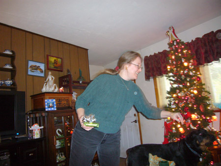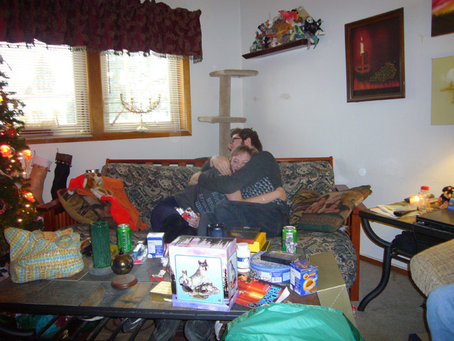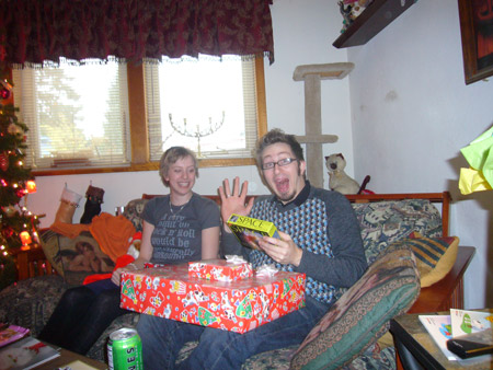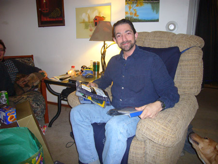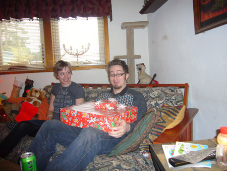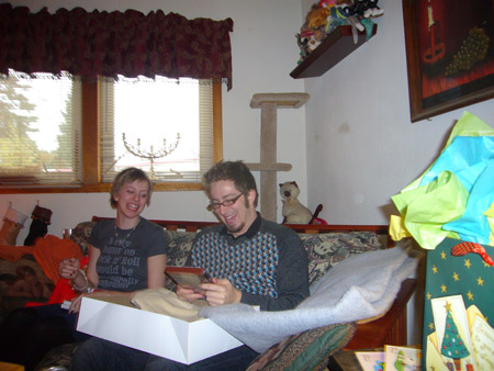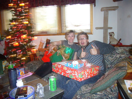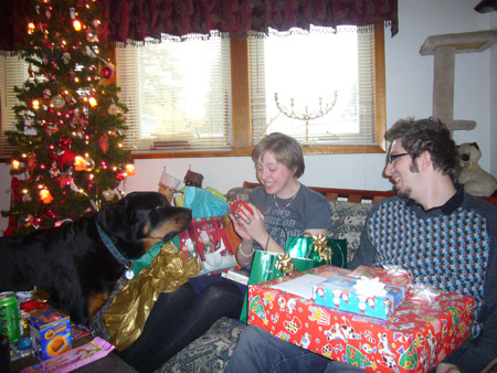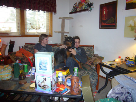 For the actual Christmas holiday, Mattman came and spent Christmas eve on the couch, and Charlotte came over for Christmas breakfast. What a treat! Oh, but Starbreaker was a bad boy. He spent all of Christmas eve in Matt's lap staring up at him like a girlfriend, and when Charlotte joined us he got jealous and bit her when she got too close. Kinda spoiled the mood. He only dented her, but it still wasn't OK. We're back on dominant doggie rules in the house because of it. However we did get some nice pics from Christmas morning, in spite of that!